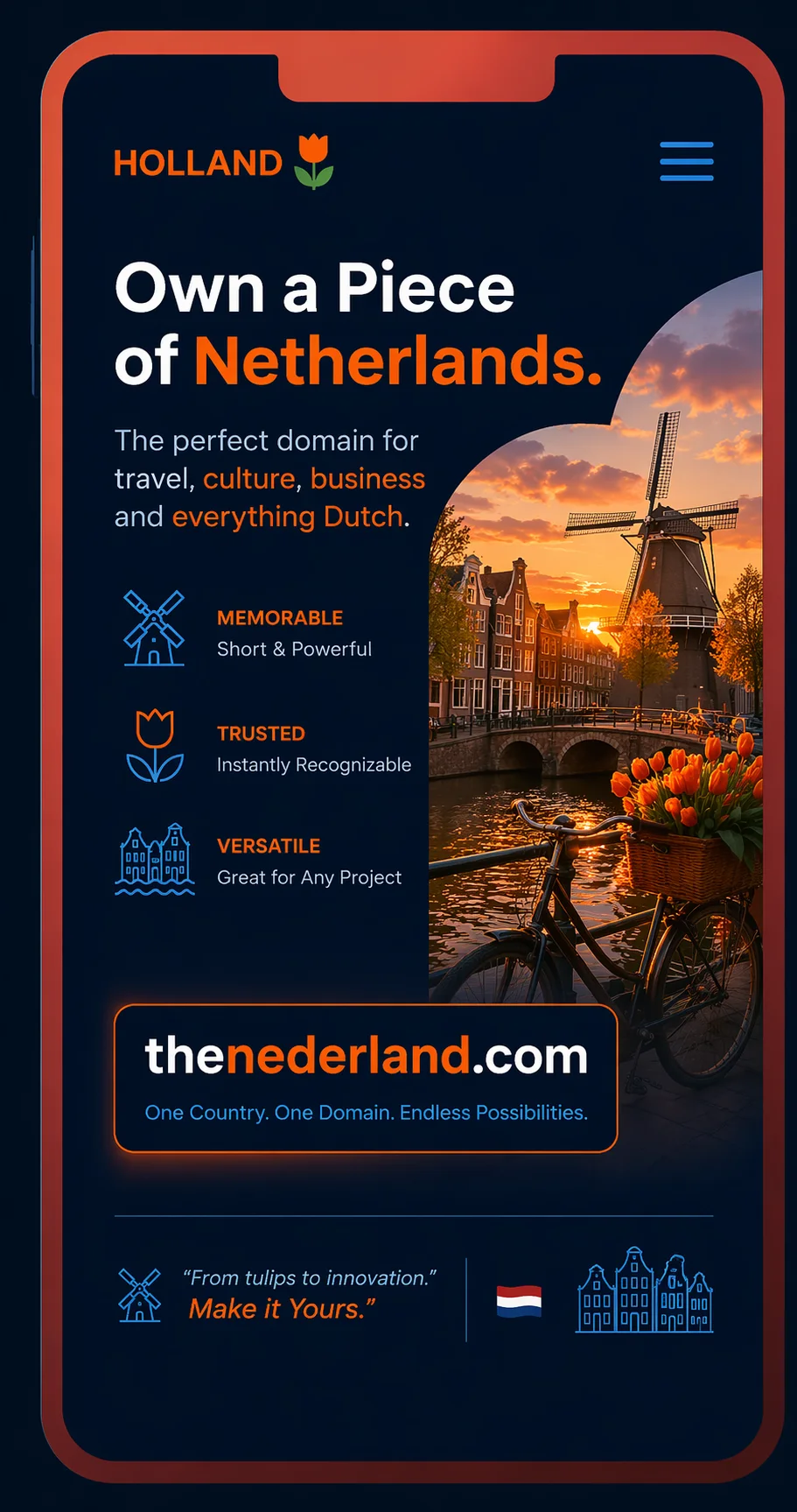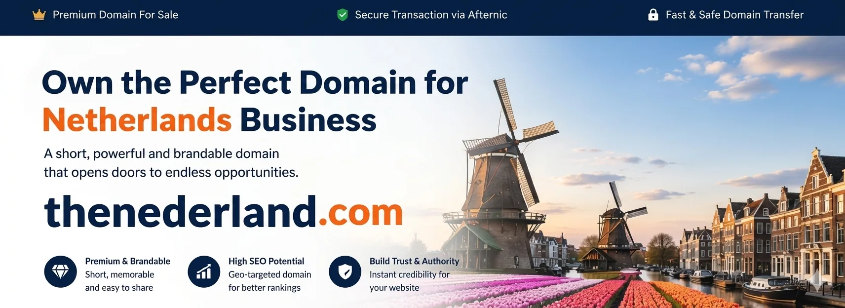 The Netherlands attracts millions of tourists yearly. This domain can help you build: ✔ Travel booking website ✔ Affiliate income platform ✔ News or blog site